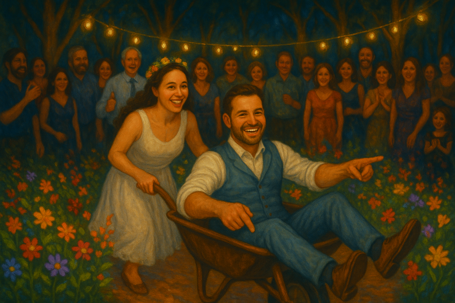 We ended up not bucking tradition much. But I had vowed to honor her rebellious spirit. I leaned over to Kerstin, exalting in the wheelbarrow, and whispered, “gender parity.” She vaulted out, I plopped in, and – surrounded by cheering family – she carted me off into the night.