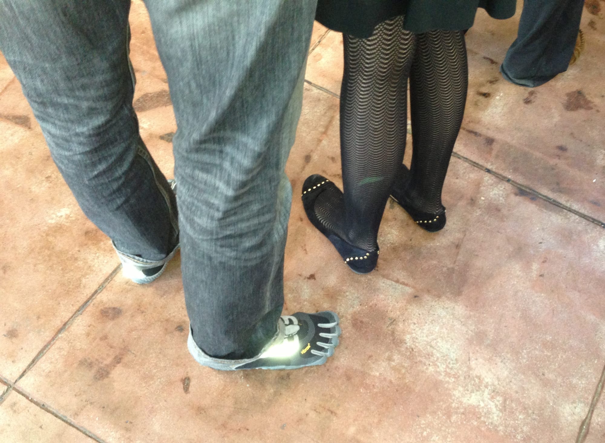 Yes, she's wearing flats and her boyfriend is wearing Vibram Five Fingers. Was he dressed for a run? Nope. Above those designer jeans he had on a nice shirt and cardigan.