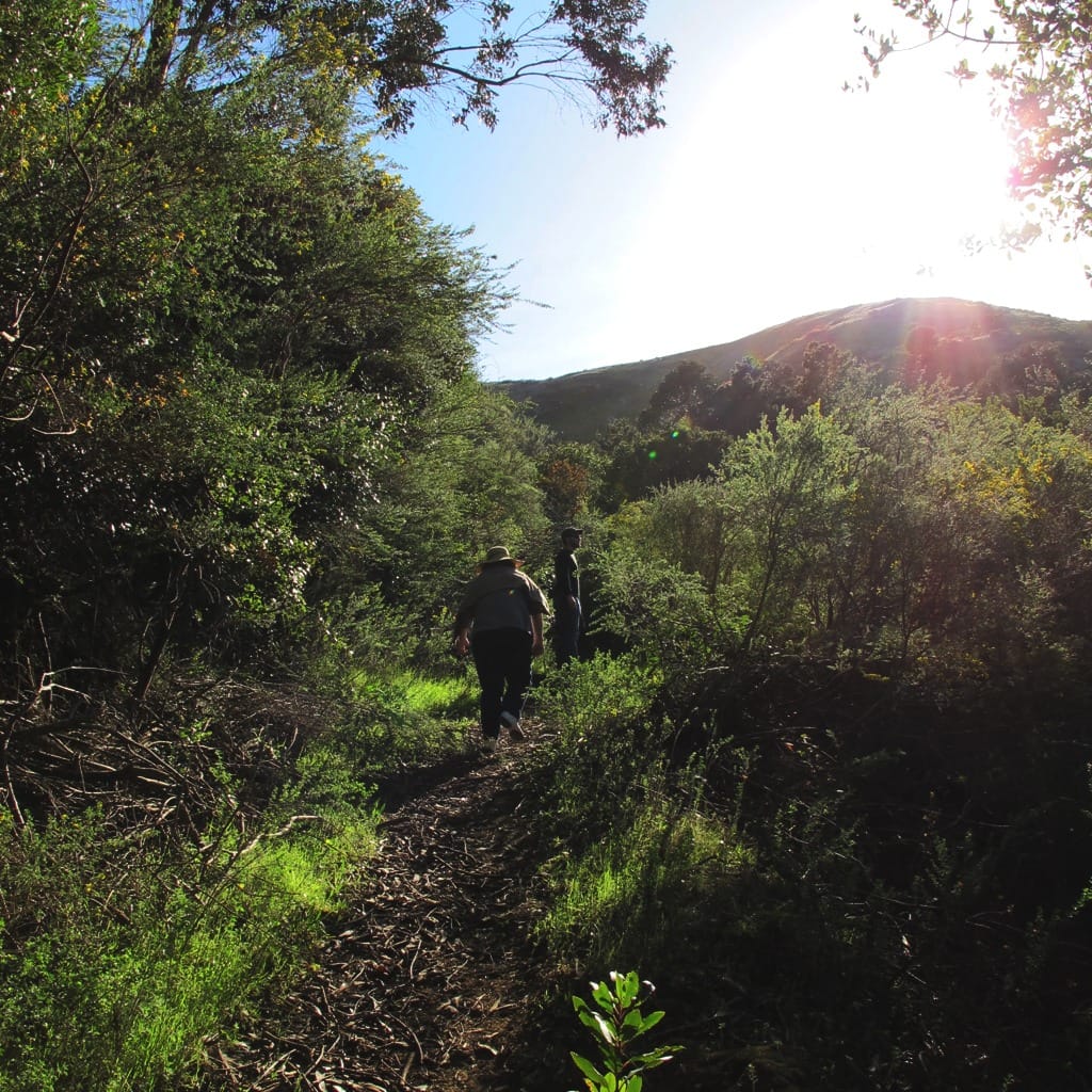 We wound our way through some very steep paved and unpaved roads, most of which turned out to be the private driveways of Brisbane residents. When we finally found a public park and trailhead, we got out of the car, judged the appropriate number of jackets we'd each need, put two water bottles on my dad's pack and started walking.